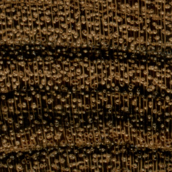 Endgrain: Diffuse-porous; solitary and radial multiples; medium to large pores in no specific arrangement, few; tyloses and other mineral deposits (yellow/brown) common; parenchyma varies slightly between species, but is generally banded (marginal), as well as vasicentric, aliform (lozenge), and confluent; medium to wide rays, spacing normal to wide.