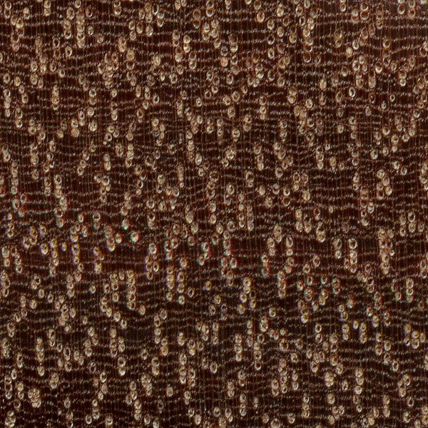 Endgrain: Diffuse-porous; radial multiples of 2-5 common; medium to large pores, few; tyloses and mineral deposits common; parenchyma diffuse-in-aggregates, reticulate; narrow rays, spacing fairly close.
