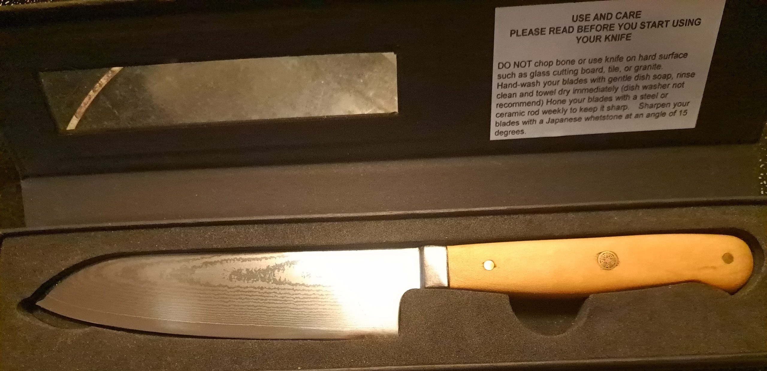 ~6 inch Santoku style knife with cherry scales, made for my mother. The first knife (handle) I’ve made. Pretty sure it is Sweet Cherry, but could very well be wrong.