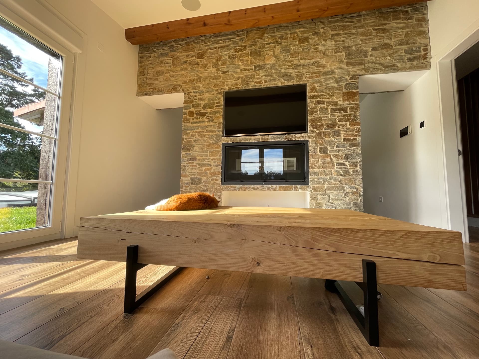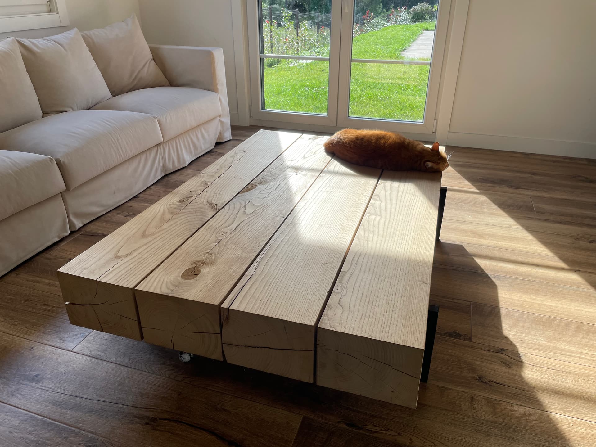 This is my living room low table, which I made out of 4 10×7″ (~25x18cm) pieces of solid spanish chestnut from, simply plained, weighting around 35kg each.