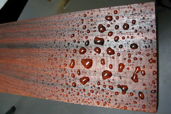 Workability: Due to the high oil content found in this wood, it can occasionally cause problems with gluing. Also, the wood’s color can bleed into surrounding wood when applying a finish, so care must be taken on the initial seal coats not to smear the wood’s color/oils into surrounding areas. Tearout can occur during planing if interlocked grain is present; the wood also has a moderate blunting effect on cutting edges/tools due to its high density. Cocobolo has excellent turning properties.