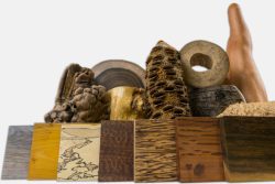 Images: Drag the slider up/down to toggle between raw and finished wood. The first sample shows a piece that has already aged to a darker brown heartwood color, while the second sample is closer to the color one could expect from a freshly cut piece.