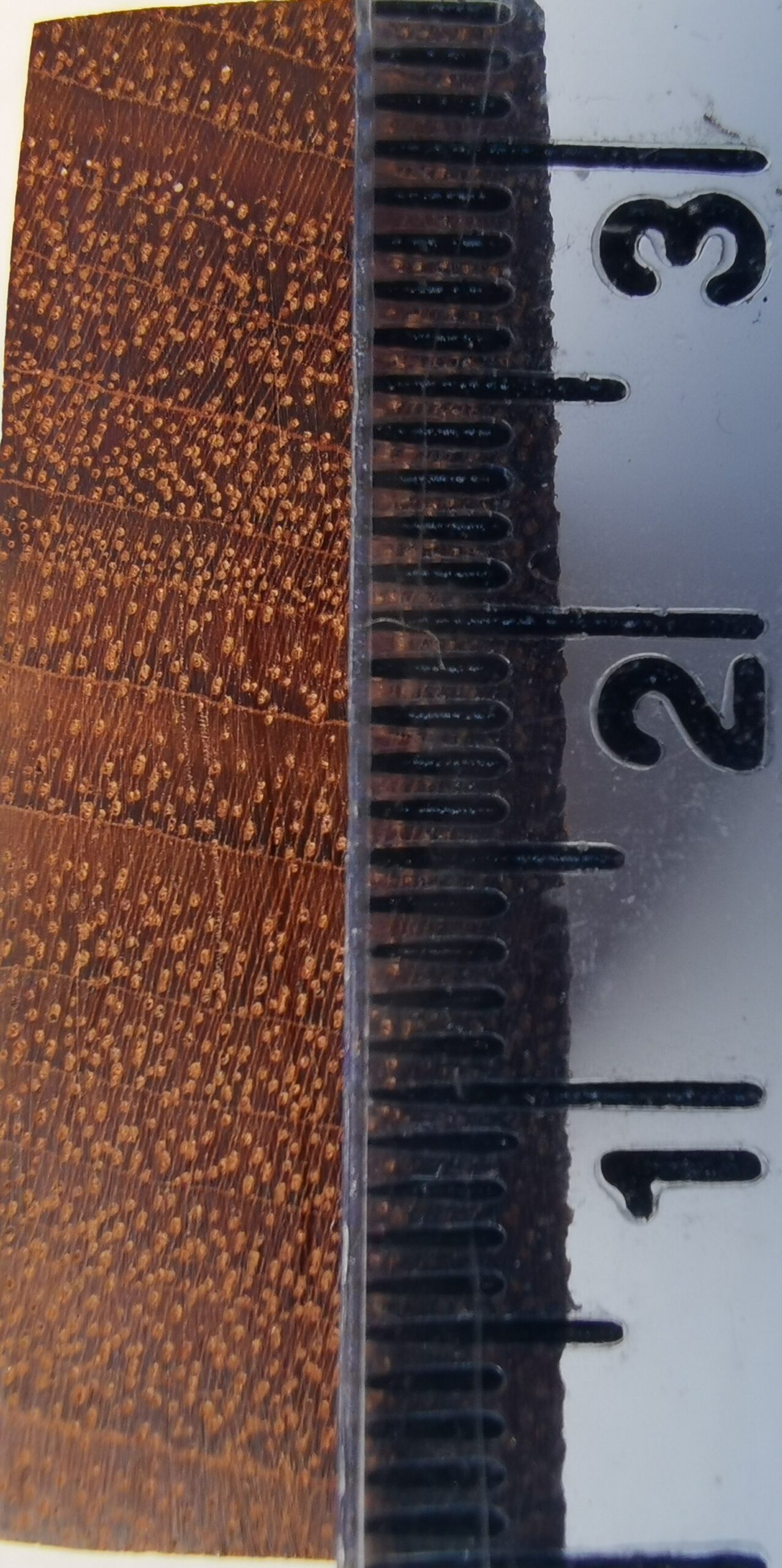 Ok, so looking for more characteristics to help with the ID…I did a calculation on a sample piece and it comes out to roughly 55 lbs/ft3. That appears to be too dense for mahogany. Using that to filter the woods you have listed, it seems to look similar to black mesquite.