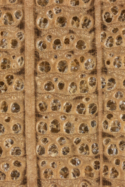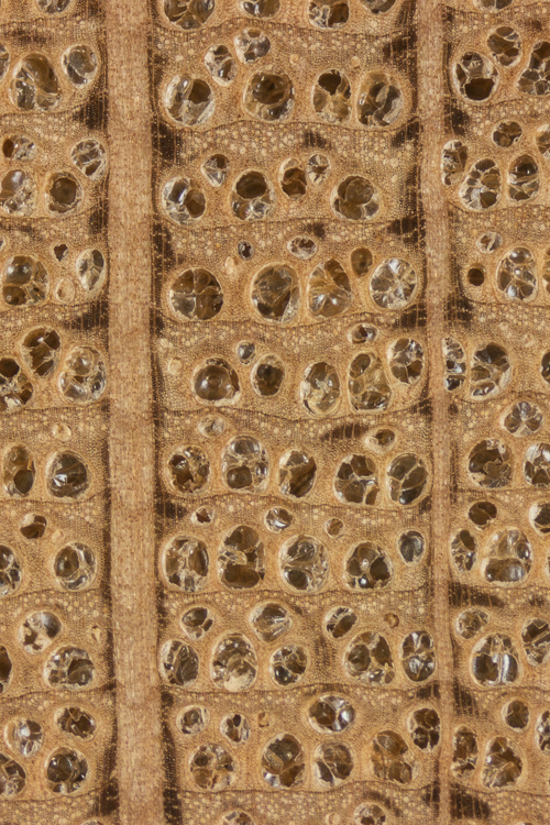 Describes the relative size and frequency of the pores (vessels), as well as any contents found in the pores, such as tyloses, colored mineral deposits, etc.