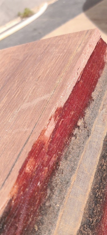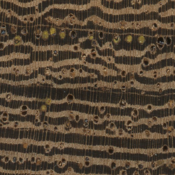 The sample of Panga Panga (Millettia stuhlmannii) has quite a few heartwood deposits; many are a striking yellow, while some are a dark brown.