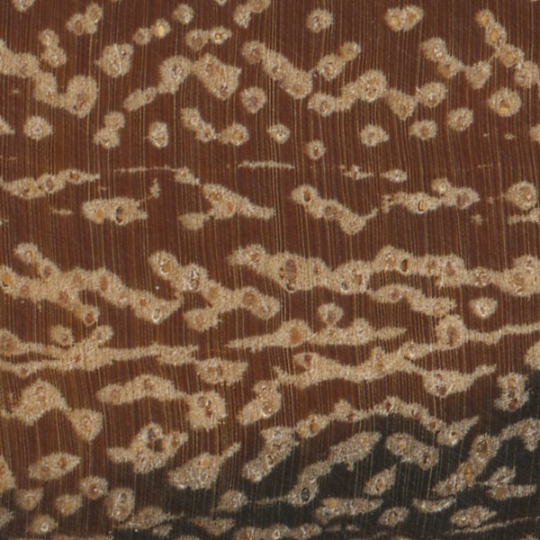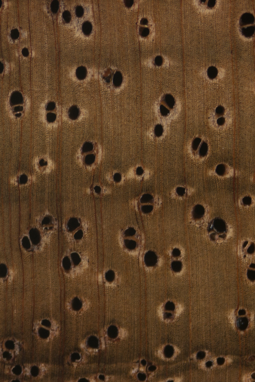 In some cases, pores can become filled with colored gums, resins, or other deposits that can aid in identification. In most species, heartwood deposits tend to be somewhat sporadic, so it shouldn’t be relied upon as a primary identifying feature. The frequency of pore contents, if present, are described using the relative terms, sparse, common, and abundant.