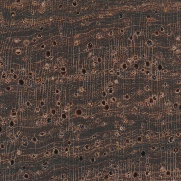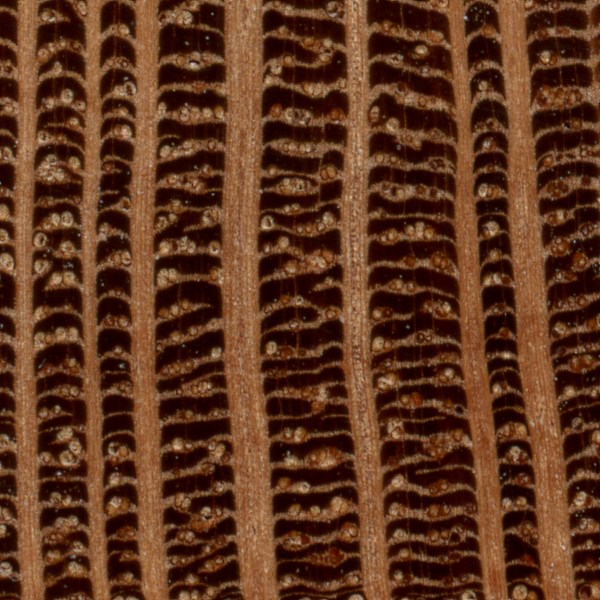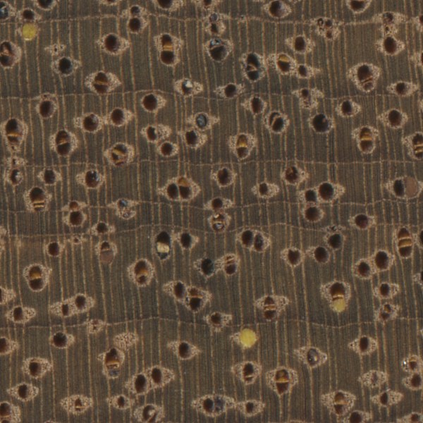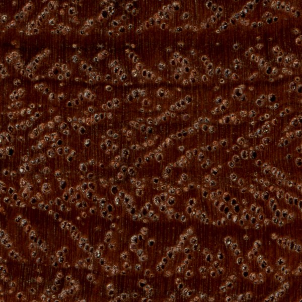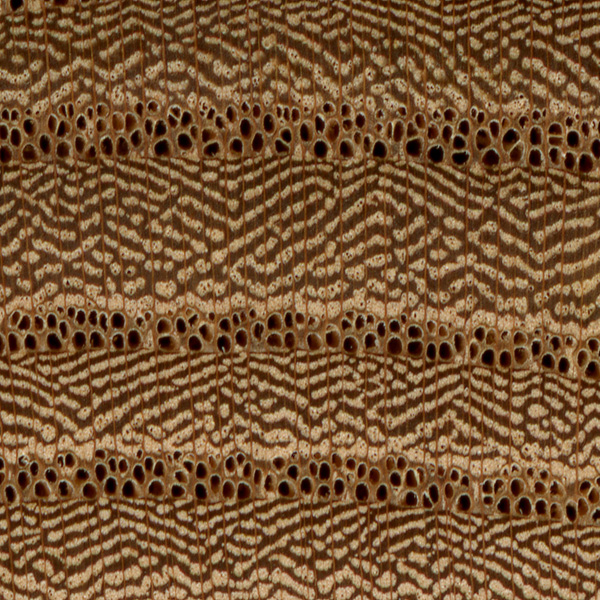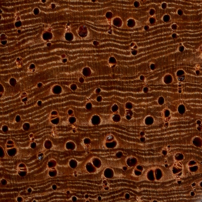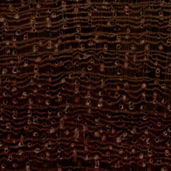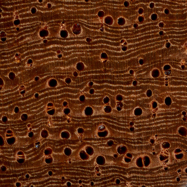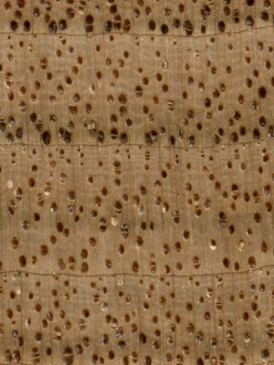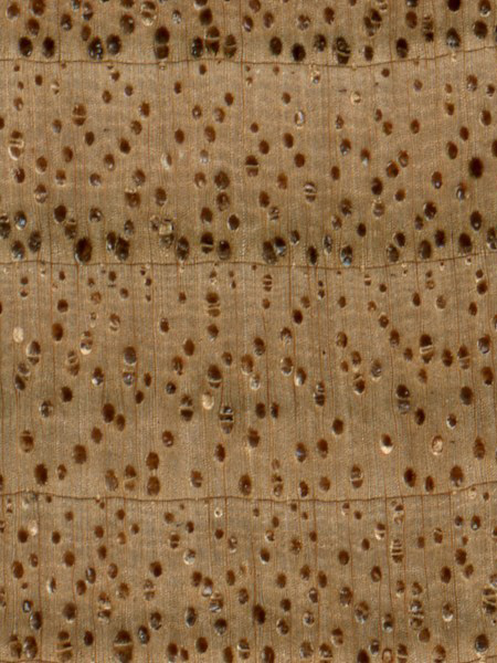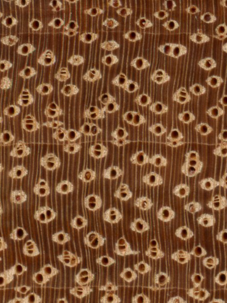Afzelia (Afzelia spp.) is an example of a diffuse-porous wood, with no clear earlywood-latewood pore arrangement, and no significant difference in pore size.