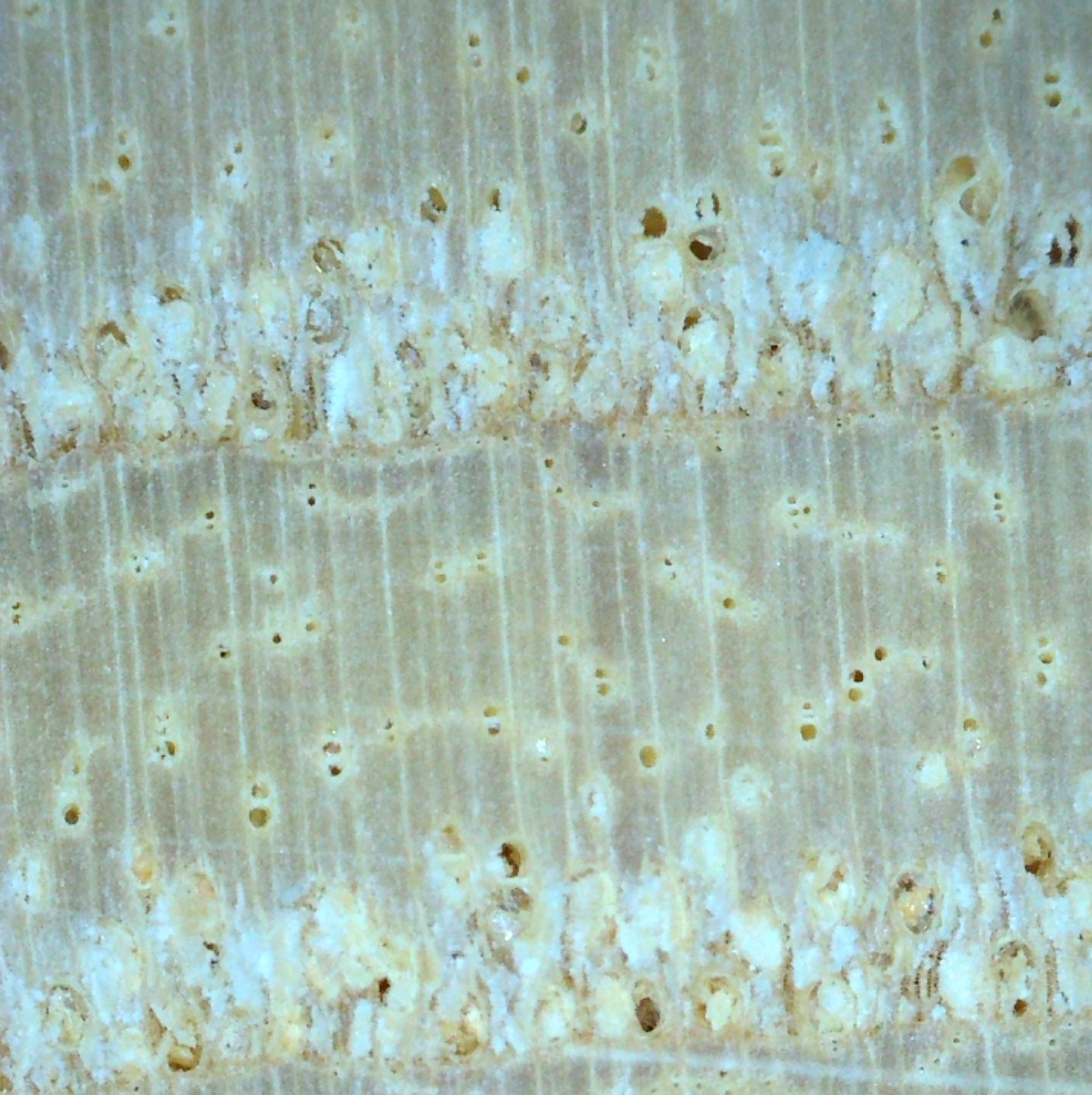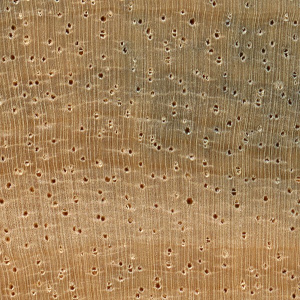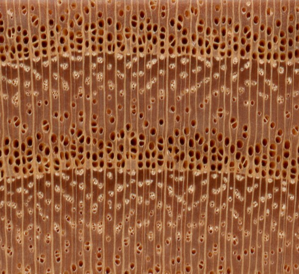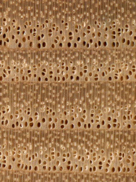 European Ash (Fraxinus excelsior) is an example of a ring-porous wood, with the earlywood pores clearly forming rings or bands—in this case two to four rows wide.