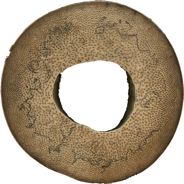 The most basic paratracheal parenchyma formation is a ring or circle of cells surrounding the pore, which is termed vasicentric parenchyma. The term vasicentric is simply a combination of the words vase (suggesting a vessel or pore), and centric, which simply indicates that the parenchyma is centered around the pore. It should be noted that vasicentric parenchyma isn’t always visible with a hand lens. If the pores of a wood species are especially small, (with the parenchyma being even smaller), or if the parenchyma ring is only one cell thick, it may not be clearly visible with a hand lens.