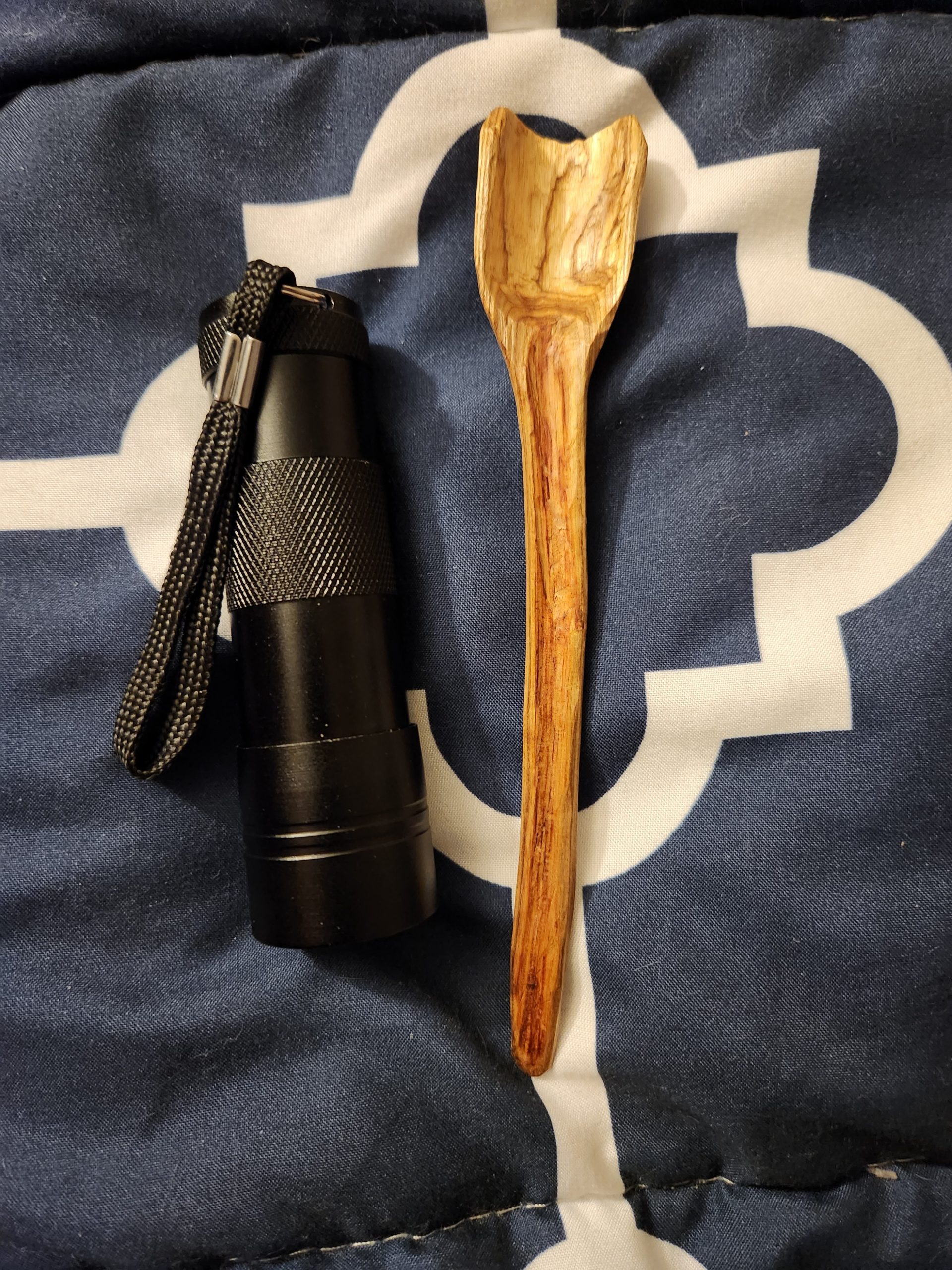 I’ve been mildly obsessed with staghorn sumac for some years now. Just carved this spoon from it tonight. Finished weight is just 4 grams and I think I could get it lower if I dug out the bowl better.