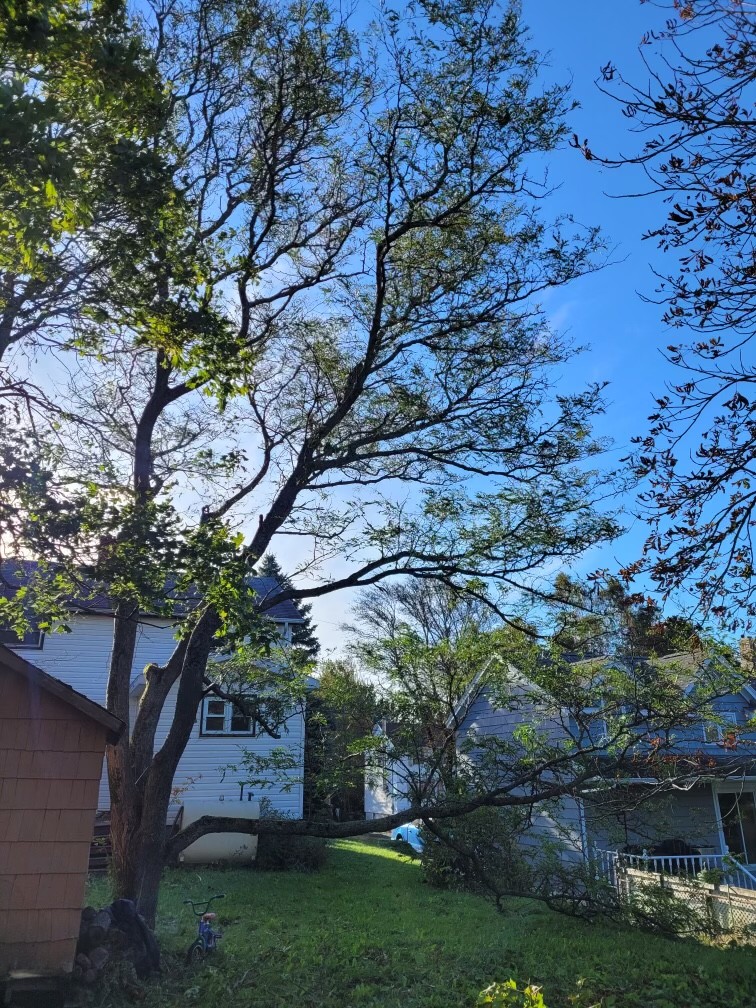 Hi I hope someone can help identify this tree that was growing in my buddie’s back yard ( Nova Scotia) until it was morally wounded by a storm and had to be cut down. The wood is very dense and fluoresces yellow under black light. I think it’s black locust but I can’t differentiate it from Honey locust. I would appreciate any input.