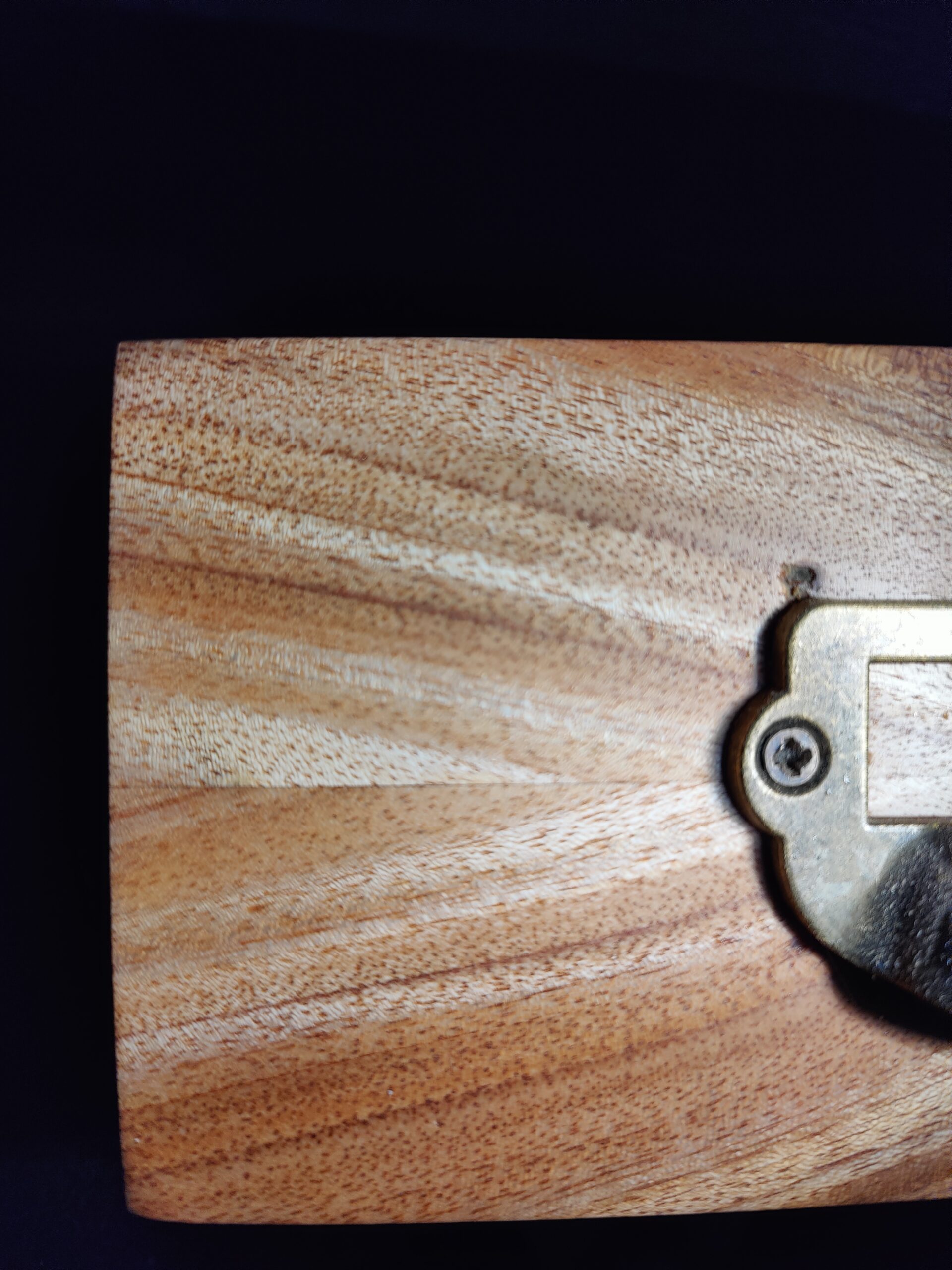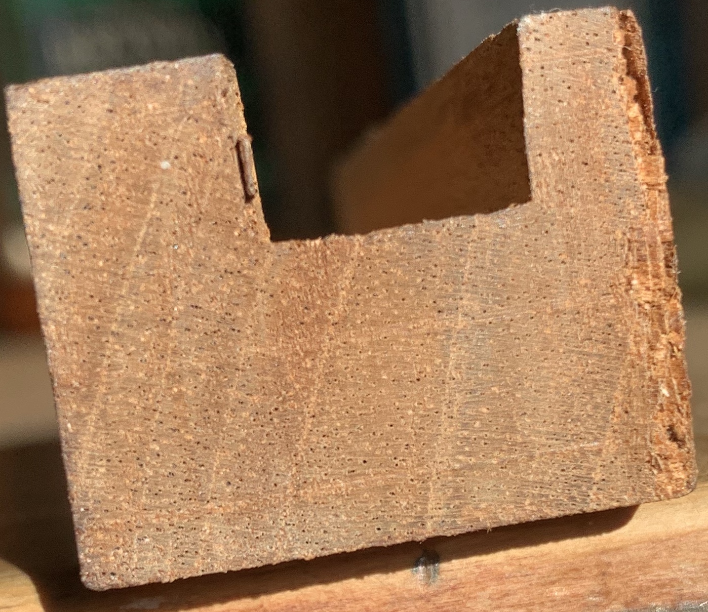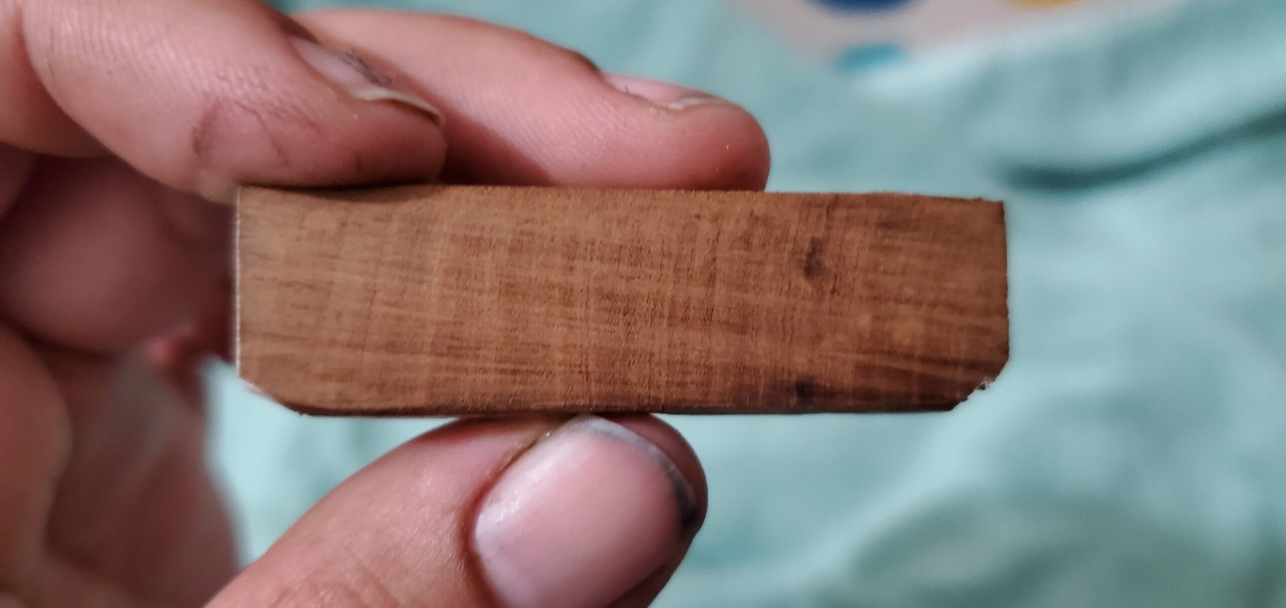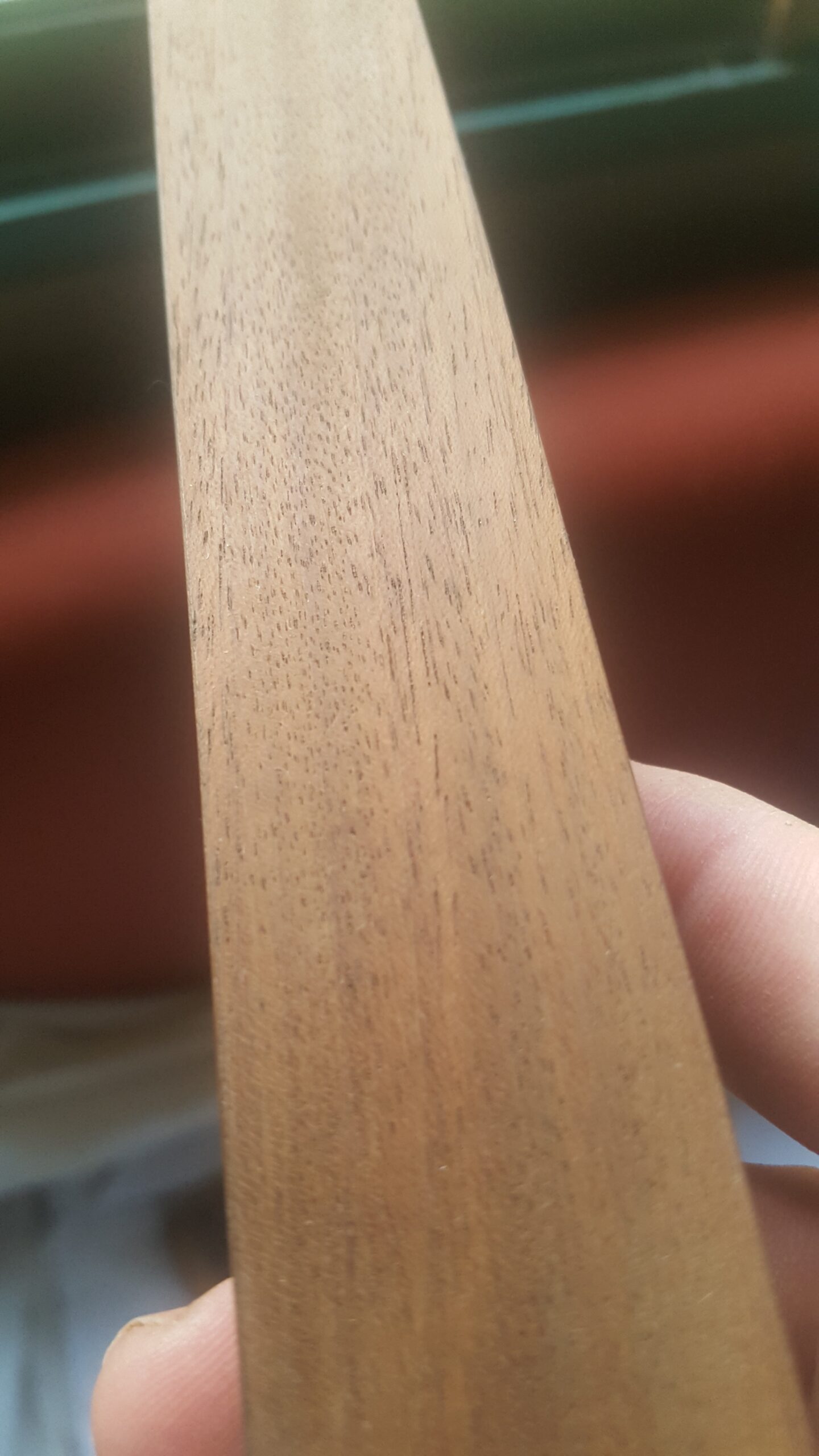 Es lo mas “ampliada” que puedo sacar una foto. Es de uno de los lados del marco trasero (cada tablilla mide solo 20mm x 4 mm de espesor) y aun mantiene sus condiciones estructurales. El color se ve algo claro por la intensidad de la luz. El color natural es mas oscuro como se puede ver en las anteriores fotos. Te agradezco mucho tu opinion. Abrazo!
