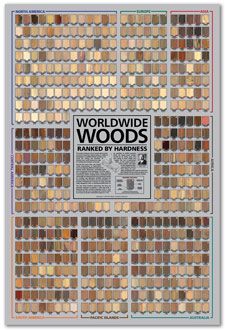 The poster, Worldwide Woods, Ranked by Hardness, should be required reading for anyone enrolled in the school of wood nerdery. I have amassed over 500 wood species on a single poster, arranged into eight major geographic regions, with each wood sorted and ranked according to its Janka hardness. Each wood has been meticulously documented and photographed, listed with its Janka hardness value (in lbf) and geographic and global hardness rankings. Consider this: the venerable Red Oak (Quercus rubra) sits at only #33 in North America and #278 worldwide for hardness! Aspiring wood nerds be advised: your syllabus may be calling for Worldwide Woods as part of your next assignment!