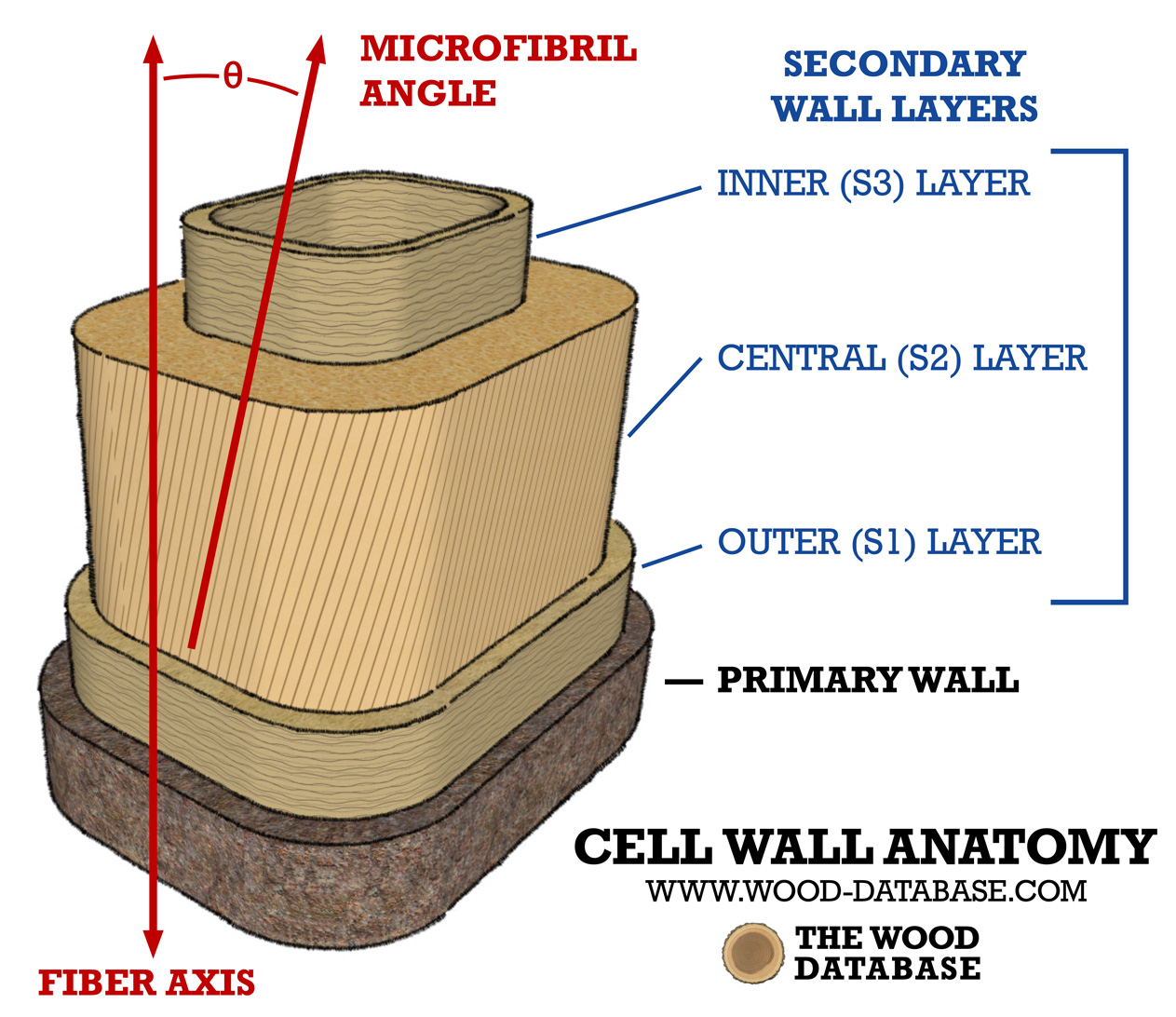 Microfibrils are tiny strands found within the cell walls of wood. Usually they run parallel with the wood grain, but that’s not always the case, and they can sometimes run at varying degrees off of parallel, which is called the microfibril angle (MFA). (See the notes in red lettering pertaining to the central S2 layer in the reference image below.)