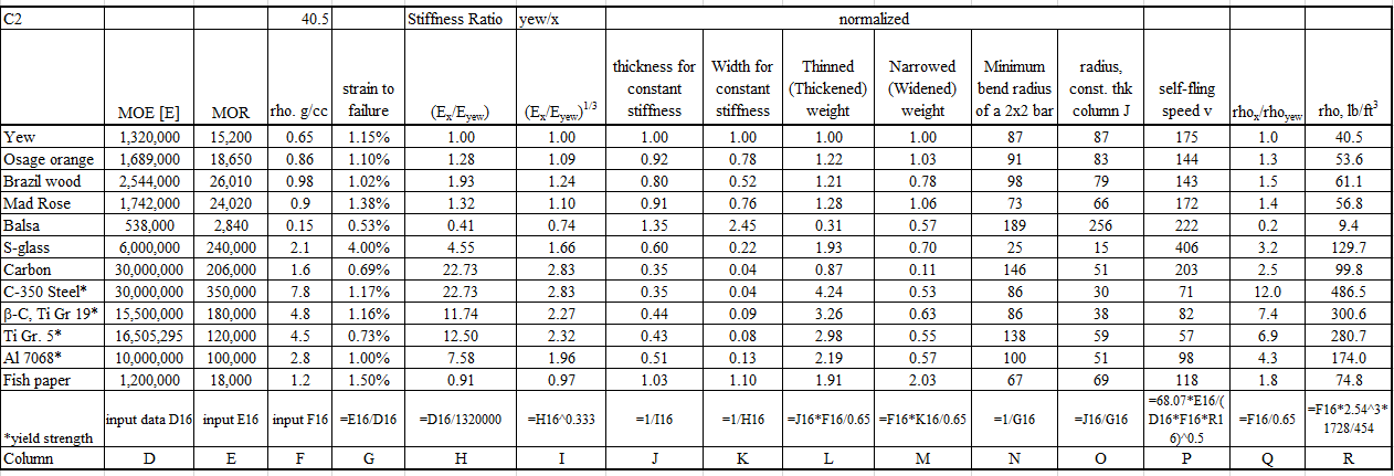 Eric, thanks for a large helping of food for thought. I have been chewing on this off and on for years. As I search the web for more information, I find a lot of sites referring back here to Eric’s Bow Index. Eric, you made your mark. I am not an archer either, I was a materials engineer by trade, so this is interesting, but I’ll never build a bow. The bow index, 1000*(MOR/MOE) is 10 times the strain to failure as expressed in percentages. In other words, MOR/MOE is the strain to failure. So the index is a mechanical… Read more »
