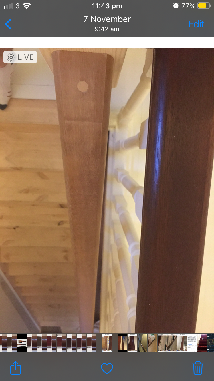 newly installed bannister (which seems to be oak?) to exact colour of existing bannsister rail next to it which seems to be brown mahogany?