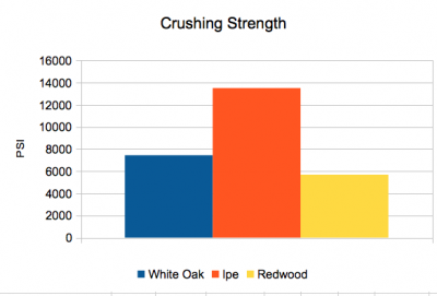 In practical terms, the number itself isn’t all that meaningful, but it becomes useful to use in comparison with other woods. For instance, Ipe is known to have excellent strength properties among imported species, and has a crushing strength of 13,510 lbf/in2 (93.1 MPa). In comparison, White Oak is a well-known wood used in cabinetry and furniture, and has a crushing strength of 7,440 lbf/in2 (51.3 MPa), and Redwood is commonly used for decking, and has a crushing strength of 5,690 lbf/in2 (39.2 MPa).