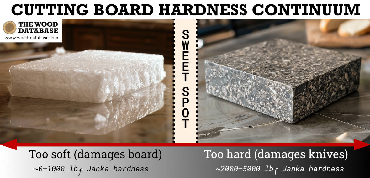 For cutting boards, most people would agree that there’s a happy medium between being too soft (and being excessively damaged with each successive knife cut) and too hard (to the point that the knife is dulled). Picture a block of styrofoam, contrasted with a slab of granite—there’s a hardness continuum.