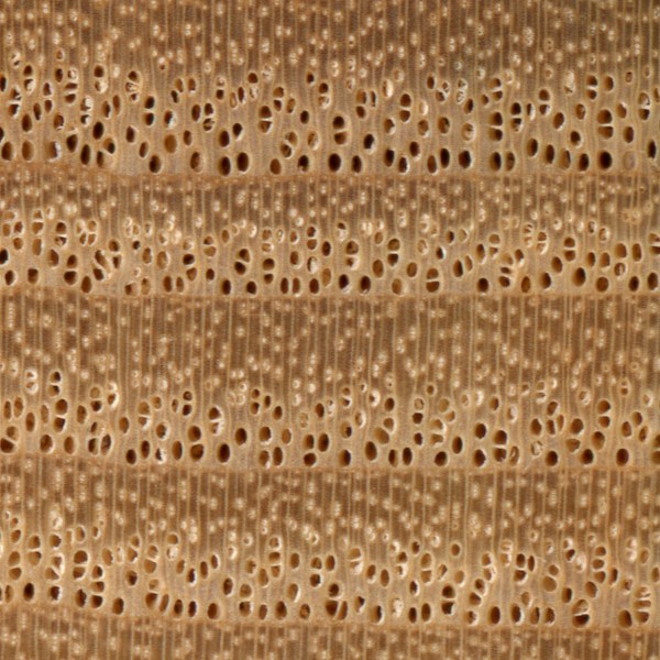 Endgrain: Ring-porous; large earlywood pores 2-4 rows wide, small latewood pores solitary and radial multiples of 2-3; tyloses common; growth rings distinct; rays barely visible without lens; parenchyma banded (marginal), paratracheal parenchyma around latewood pores vasicentric, aliform, and confluent.